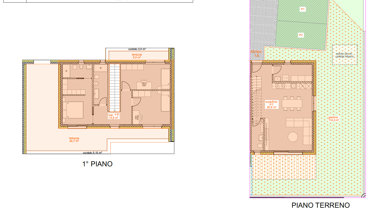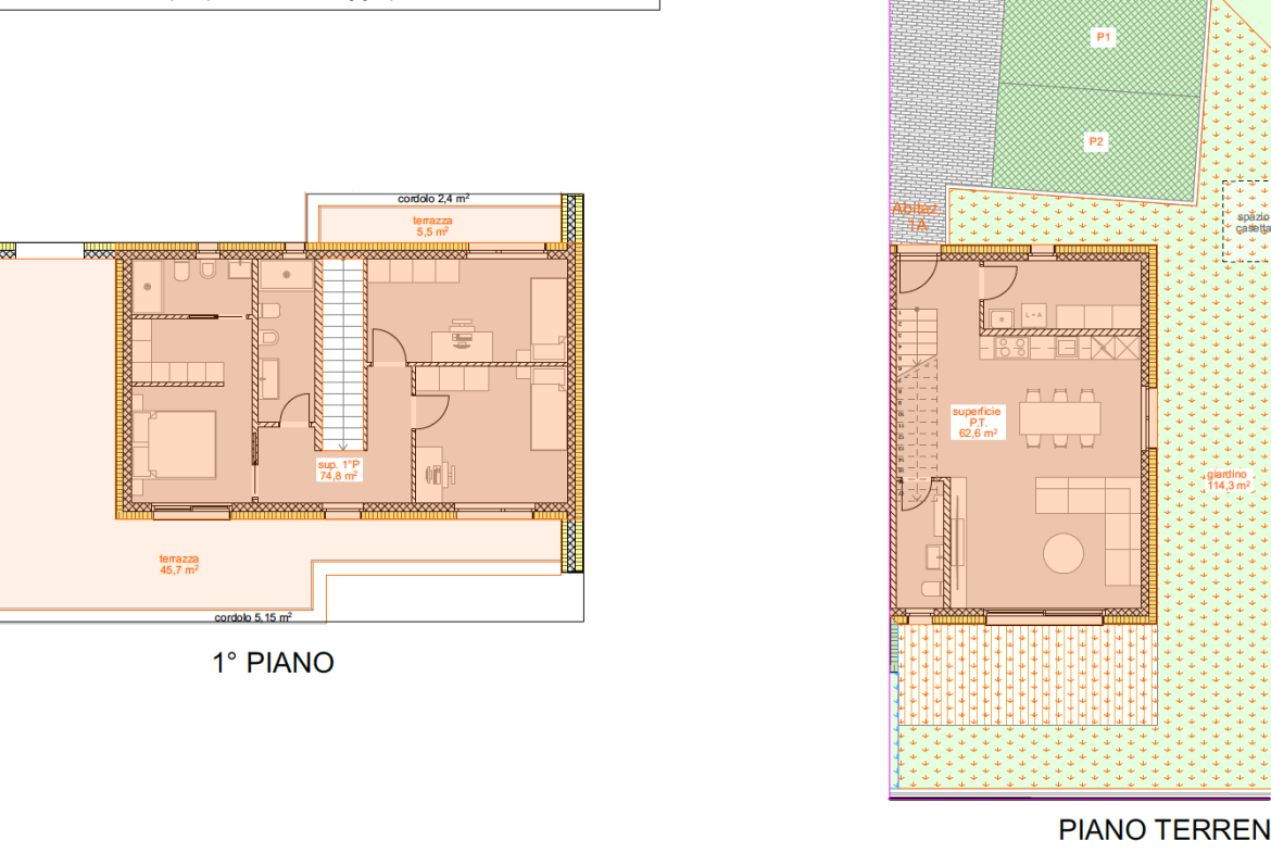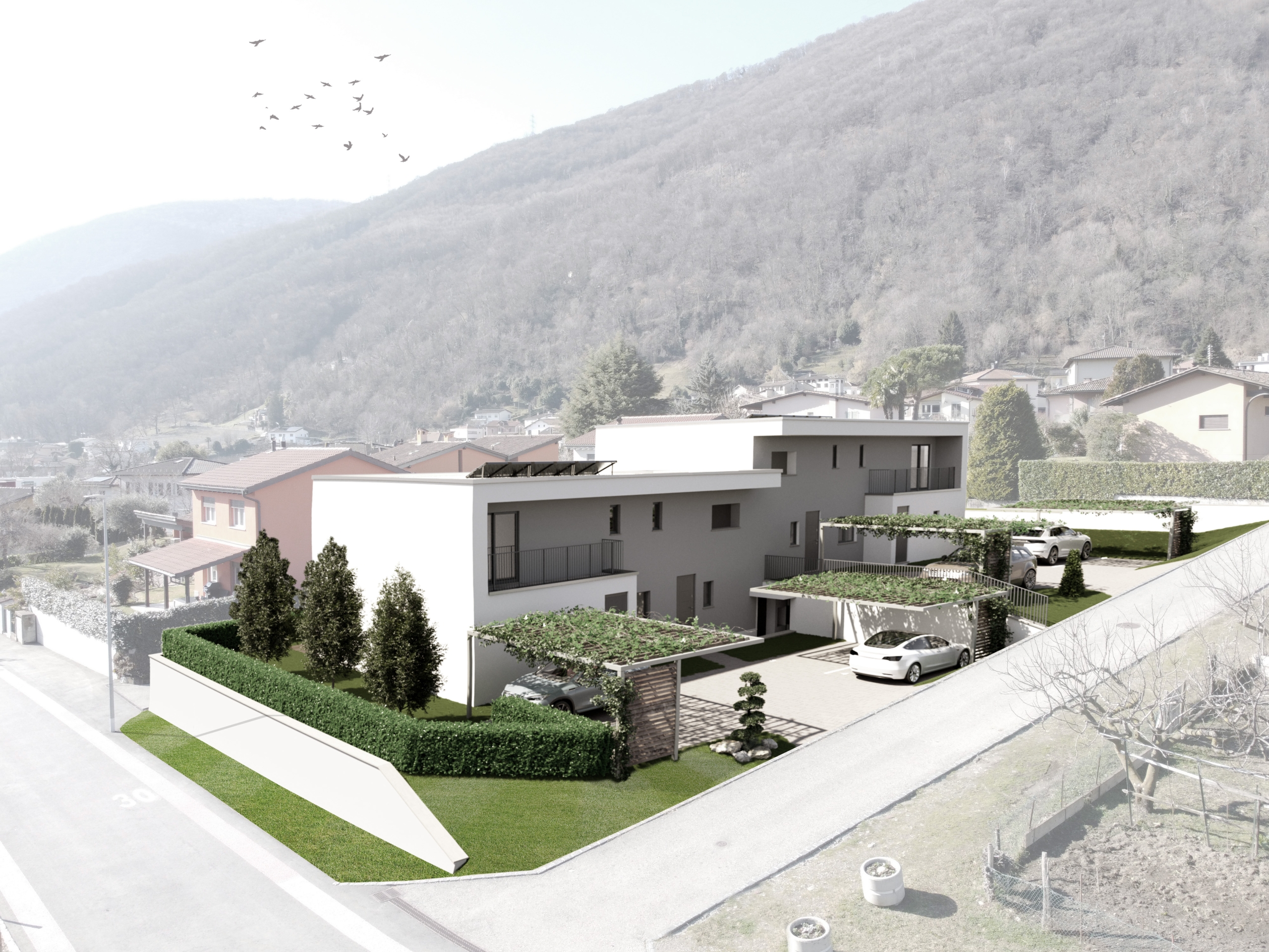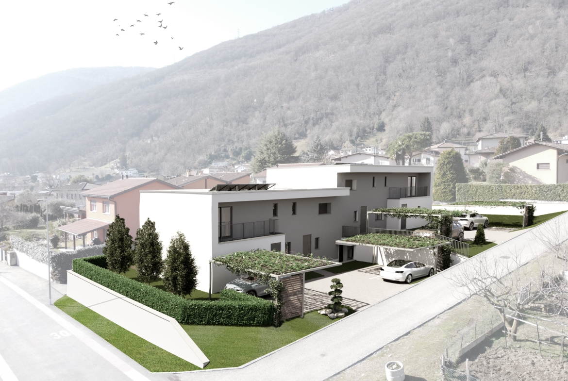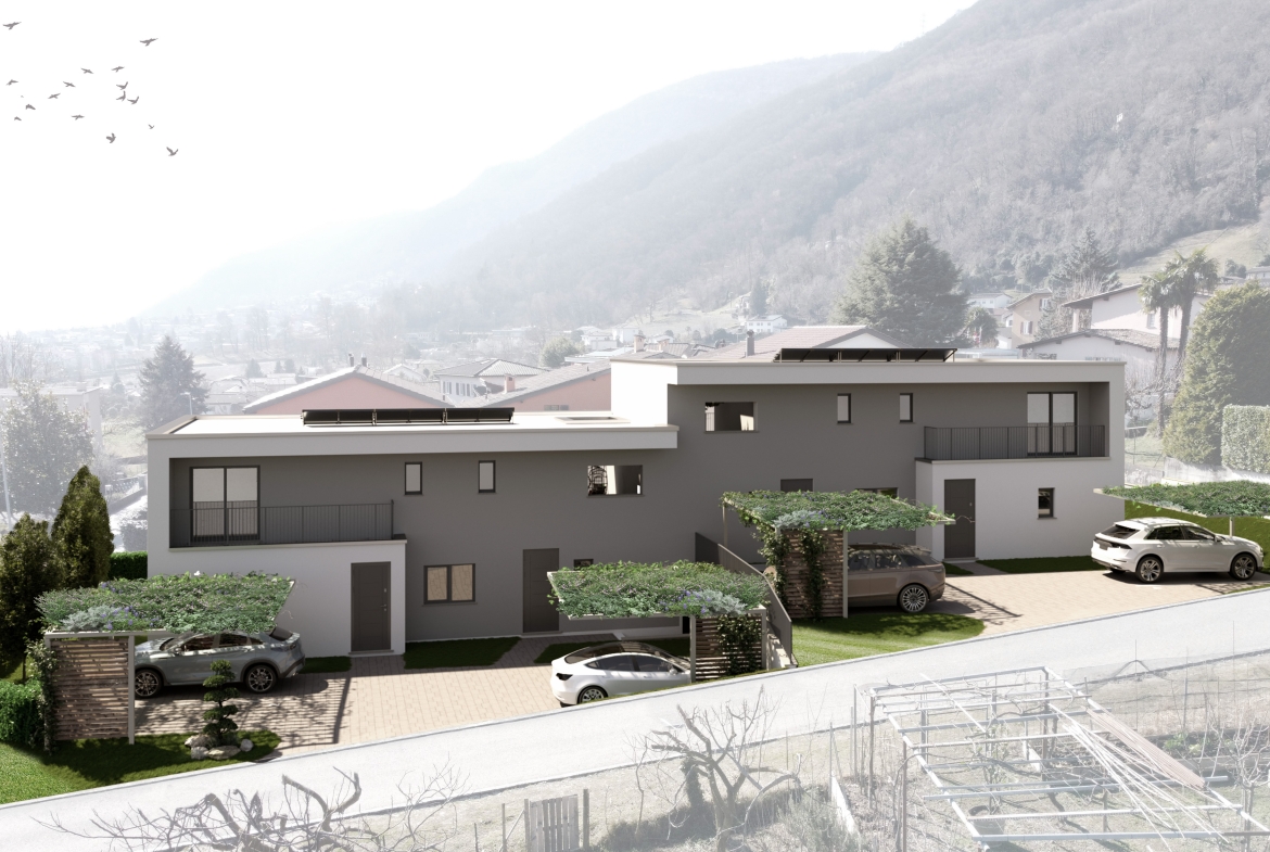 Le 4 unità ospitano 2 appartamenti di 3.5 locali con giardino che saranno disposti al centro dell’edificio, mentre ai due estremi si collocheranno i due 4.5 locali, anch’essi con giardino e un enorme terrazzo al piano superiore. Nel caso dei 4.5 locali la disposizione interna è di tipo duplex. Una lavanderia-magazzino è stata inserita al piano terra di ogni appartamento. Tutti gli appartamenti avranno un giardino. Inoltre, sono dati nel prezzo di acquisto 2 parcheggi per abitazione che saranno posti sul fronte dell’edificio. I posti auto avranno una pergola come copertura.