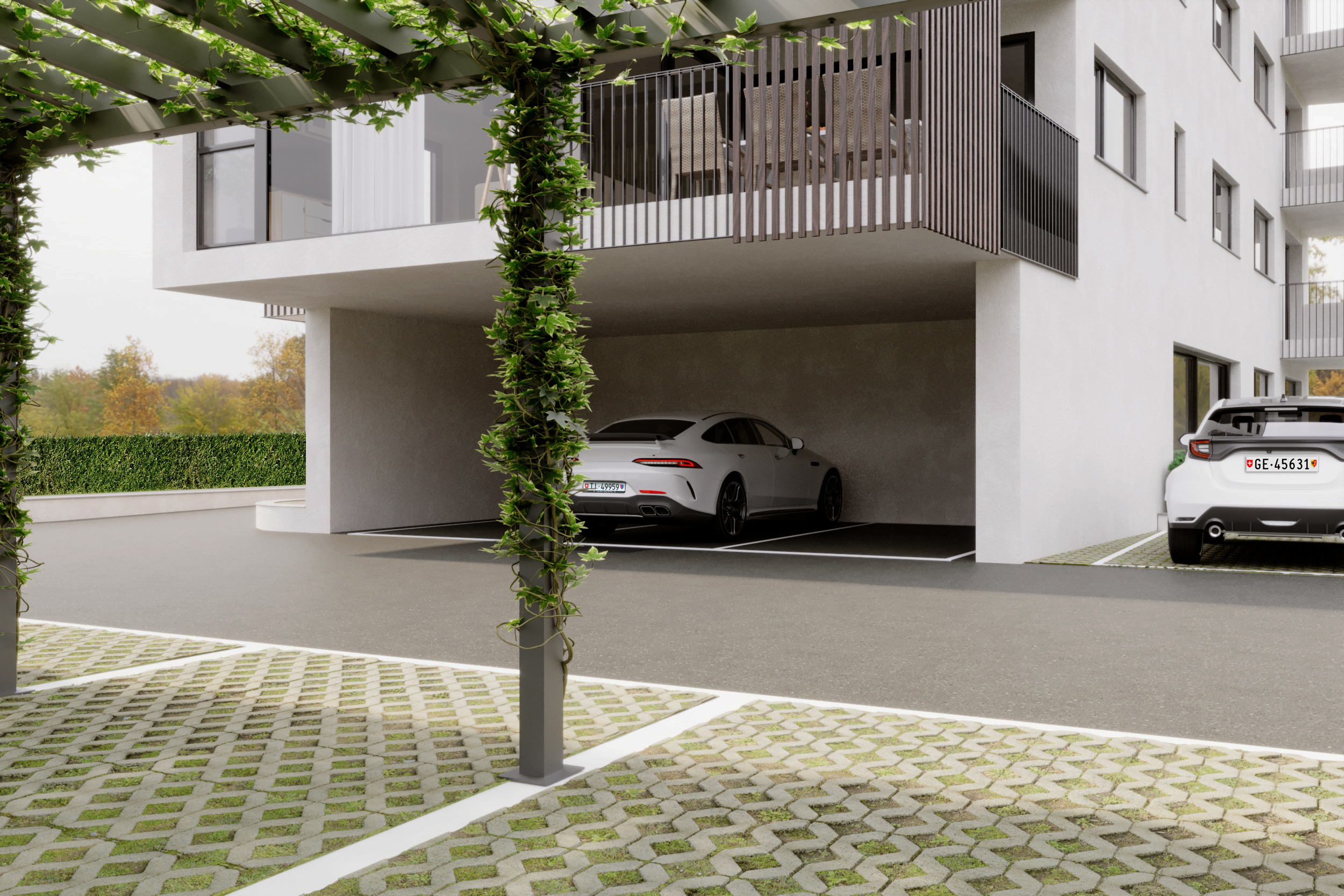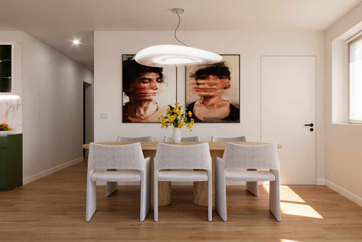 Al piano terreno troviamo un generoso appartamento di 3 ½ locali con giardino privato. L’appartamento sarà composto da un soggiorno con cucina aperta, due camere, due bagni ed una uno spazio dedicato per lavatrice e asciugatrice.
